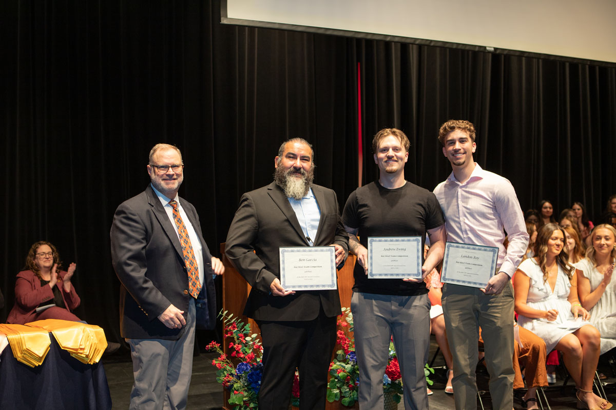 (From left to right) Radiologic technology graduates Benjamin Garcia ’25, Andrew Ewing ’25 and Landon Roy ’25 earned third place in a written and oral competition against other Kansas radiologic technology students.